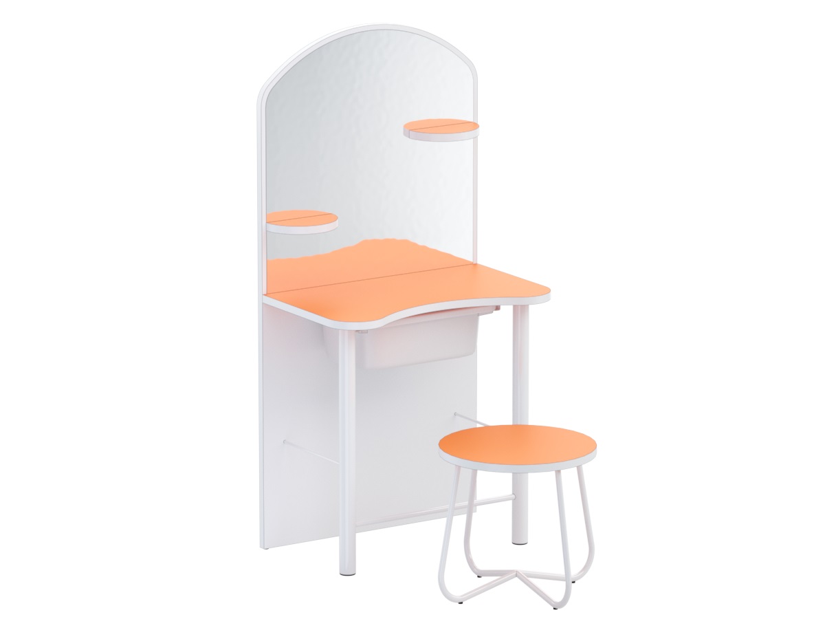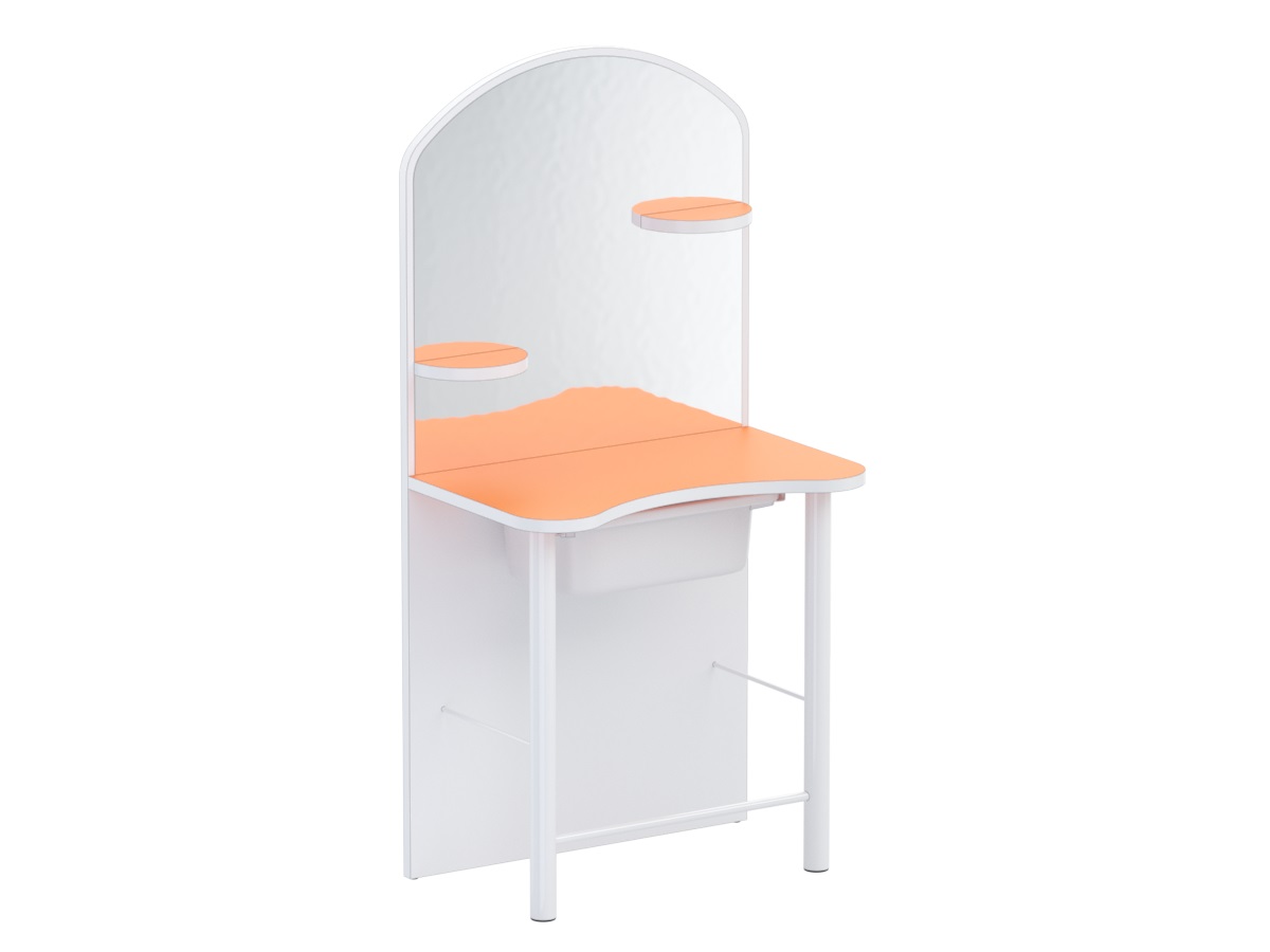Стол  Фея выполнен из ламинированной ДСП 16 мм, края обрамлены кромкой ПВХ 2 мм, все углы закруглены. Конструкцией стола игрового (Парикмахерская Фея) предусмотрена пленка зеркальная (имитация зеркала). Под столешницей стола предусмотрен выдвижной лоток.  Задняя стенка и металлические ножки имеют полимерные подпятники, предотвращающие повреждение напольных покрытий. Габаритный размер стола: 500х316х962(1022) мм.