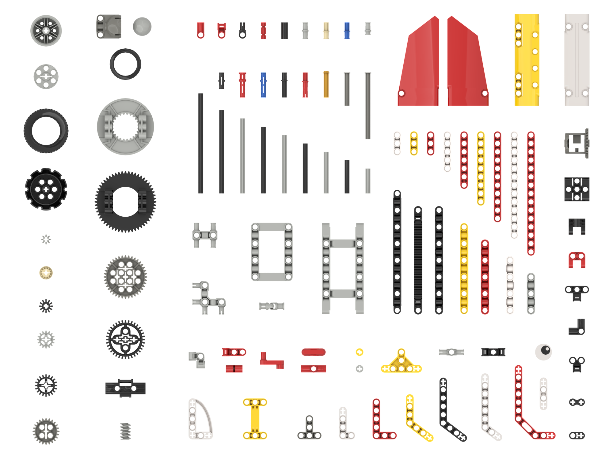 В комплект входят 777 деталей, среди которых шестерни, колеса, балки и крепежные детали.