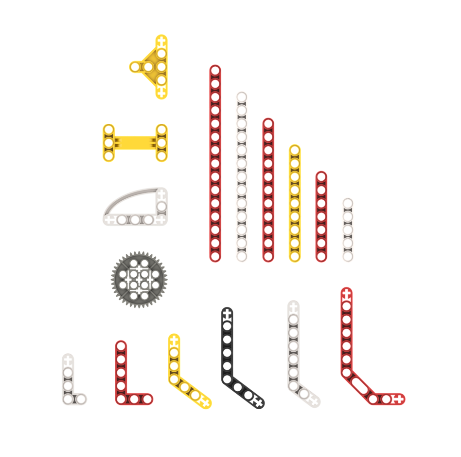 В комплект входят 52 детали, среди которых балки и шестерни.