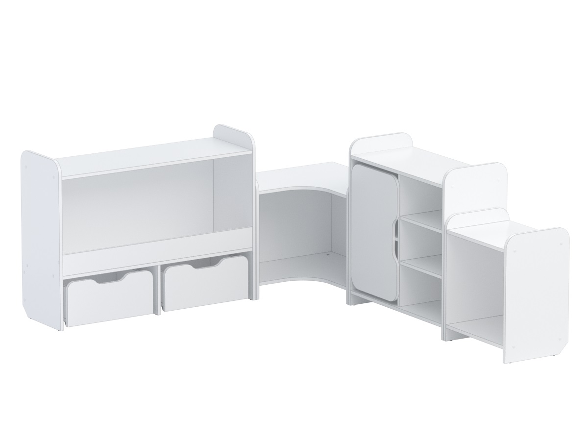 Конструкция стеллажей не имеет острых граней и углов. Стеллажи «Росток» выполнены в белом цветовом решении.Возможно приобретение каждого из элементов стеллажей в отдельности. Стеллажи можно комплектовать в любой последовательности, а так же можно отделить в группе игровую зону.