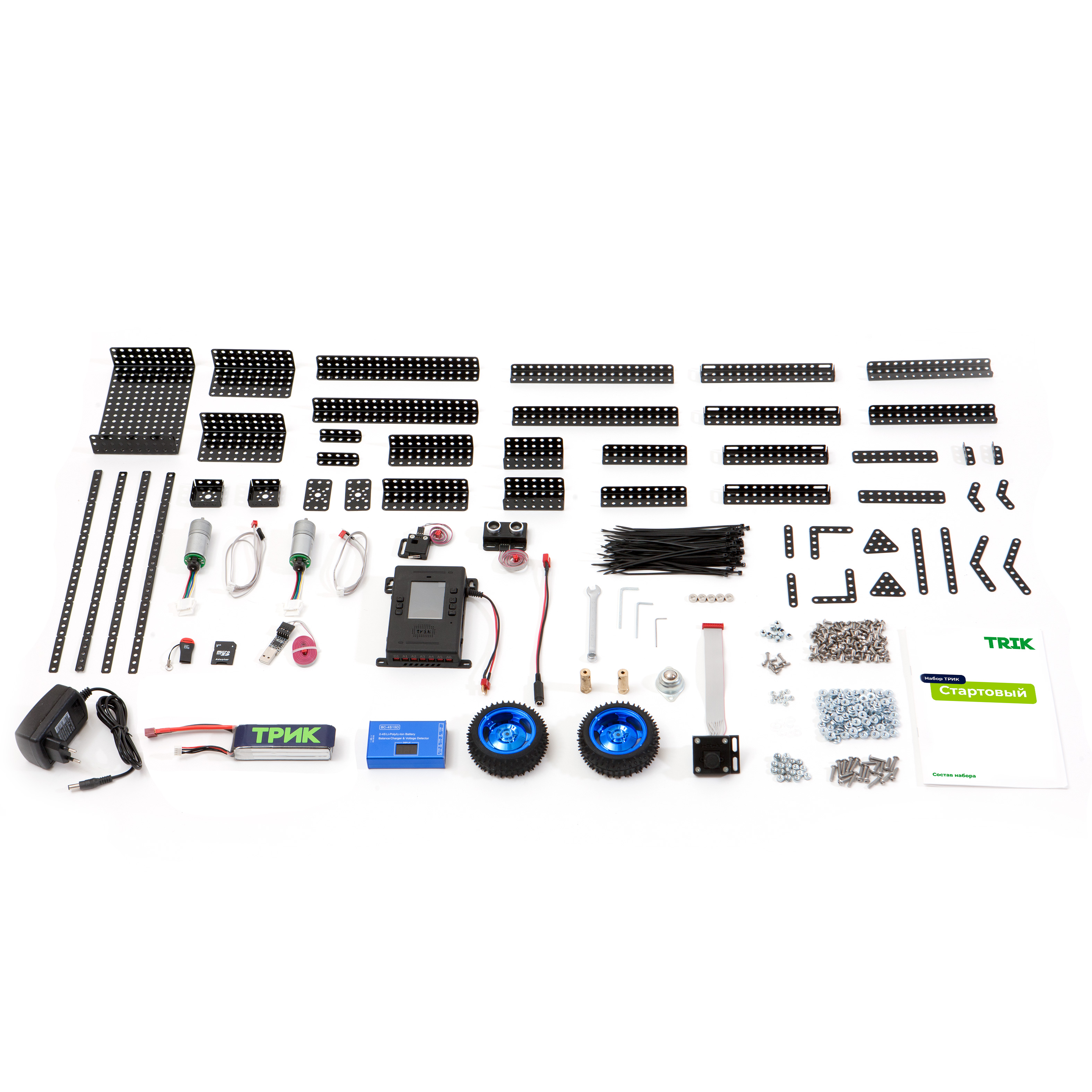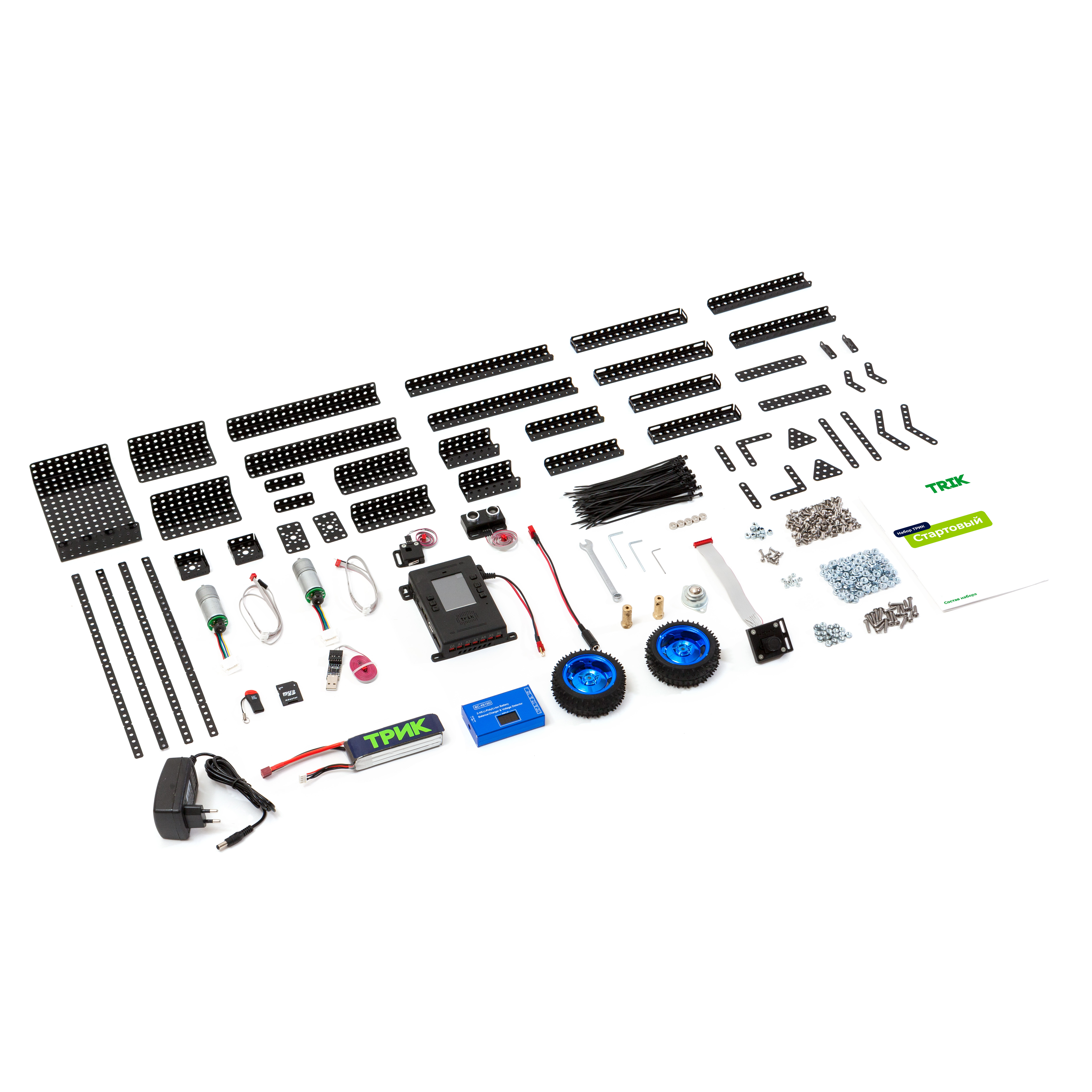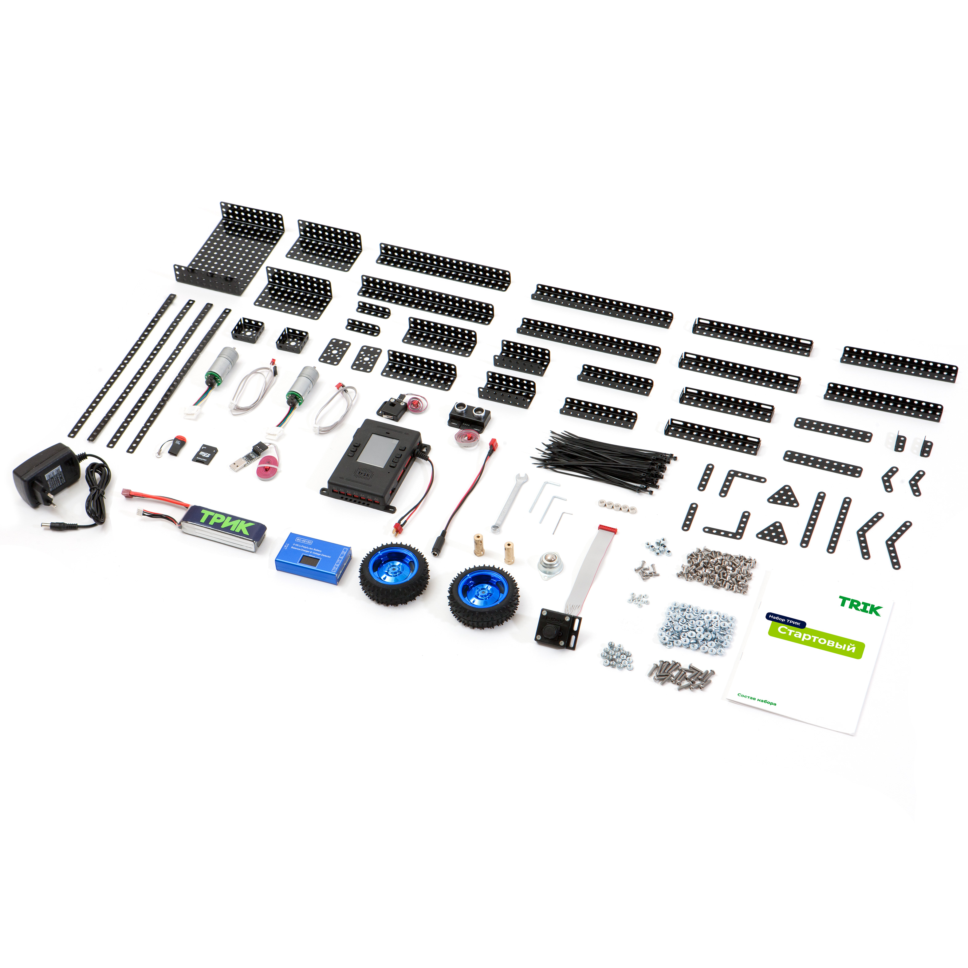 Робототехнический набор ТРИК "Стартовый" содержит все необходимое, чтобы собрать своего первого робота. С его помощью можно собрать не только игрушку на радиоуправлении, но и школьное пособие по изучению базовых основ программирования и кибернетики.