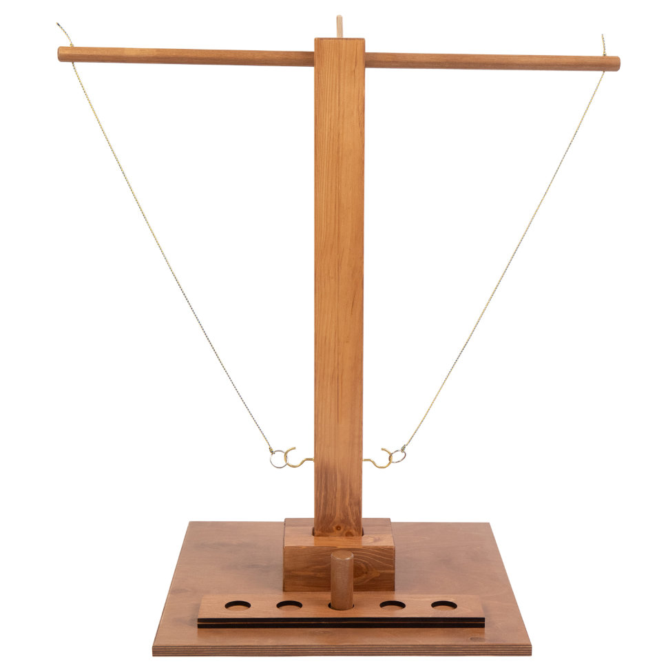 Настольная деревянная игра «На крючке» развивает мелкую моторику рук, ловкость, усидчивость и концентрацию внимания. Игра рассчитана на двоих игроков любого возраста. Задача игры состоит в том, чтобы забросить кольцо на крючок. Подсчет очков ведется с помощью маркера очков, расположенного на основании игры. На нем имеются 7 отверстий, в которые вставляется фишка. В классическом варианте игры нет очередности и ограничений по количеству попыток, поэтому как только игрок это сделает, то он переставляет фишку, установленную в центре маркера очков на один шаг к себе. И так продолжается игра на скорость и меткость до тех пор, пока фишка не придёт к финишу. Выиграл соответственно тот, на чьей стороне финишировала фишка. Можно играть вариант "от себя", когда участники должны будут постараться насадить крюк на кольцо быстрее соперника. Каждый раз, когда игрок добивается успеха, он перемещает фишку на маркере очков на один шаг в сторону противника. Тот, кто получает фишку на своей базе, проигрывает. Или устройте соревнование : у каждого игрока есть 10 попыток, чтобы попытаться набрать как можно больше очков, насаживая кольцо на крючок. Выигрывает тот, кто сможет сделать это большее количество раз. Если у игроков равное количество очков, то им даются дополнительные попытки, которые они осуществляют по очереди, пока один из них не наберет «золотое очко». Или же игроки по очереди бросают кольцо и получают 1 очко каждый раз, когда они успешно зацепляют кольцо. Первый игрок, набравший 10 очков, побеждает в игре. Комплектация: основание - 1 шт, съемная балка с крючками - 1 шт, фишки для подсчета очков - 2 шт Размер : высота 71 см Материалы : массив дерева, металл, фанера, покрытие - морилка, акриловый лак