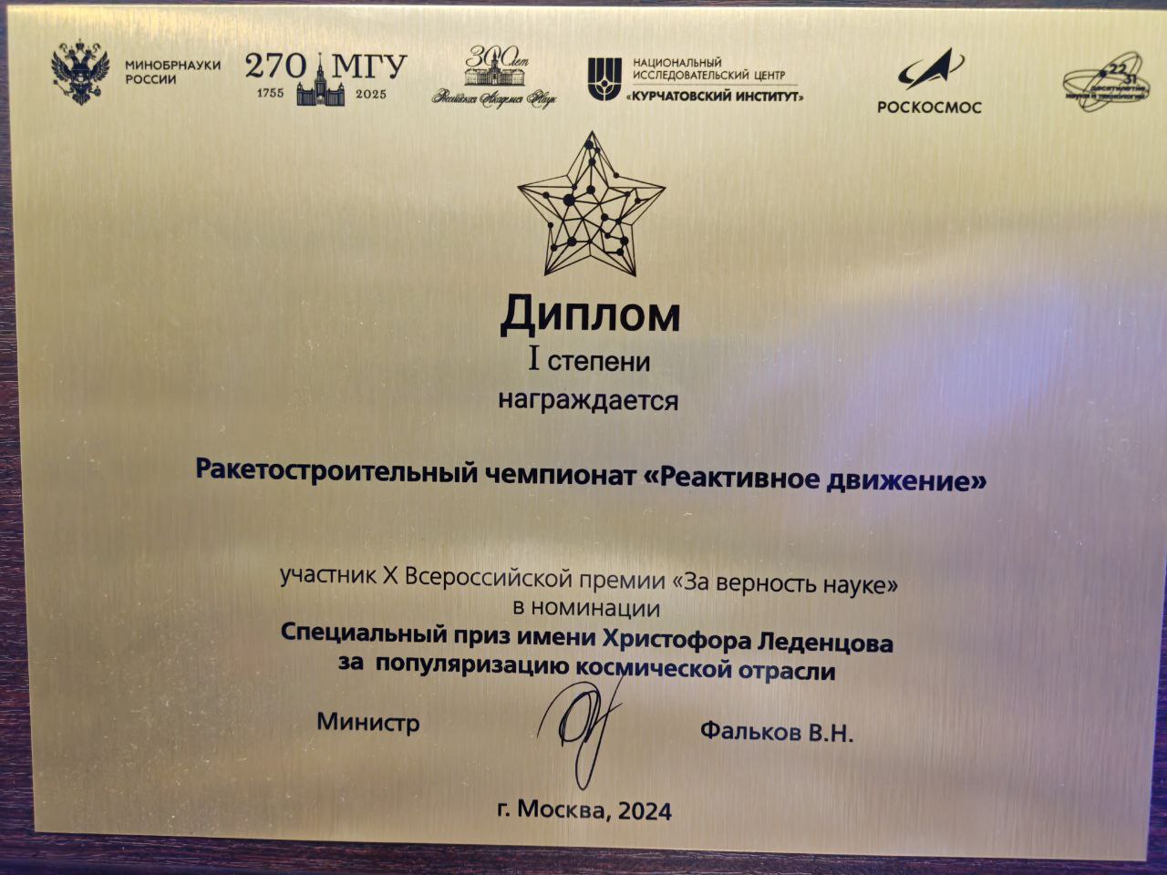 Дипломы и награды Образовательный комплекс твердотопливная ракета с контроллером полета К3 МАКС