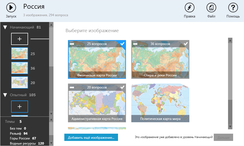 Продукт содержит многоуровневую игру-викторину, посвящённую географии России. В ней собраны вопросы по рельефу, гидрографии, береговой линии и основным городам страны. Вопросы распределены по трём уровням сложности — «Начинающий», «Опытный» и «Профессионал». Руководство, как создать свою уникальную викторину и подробная информация о продукте, размещены на сайте компании ОС3.
