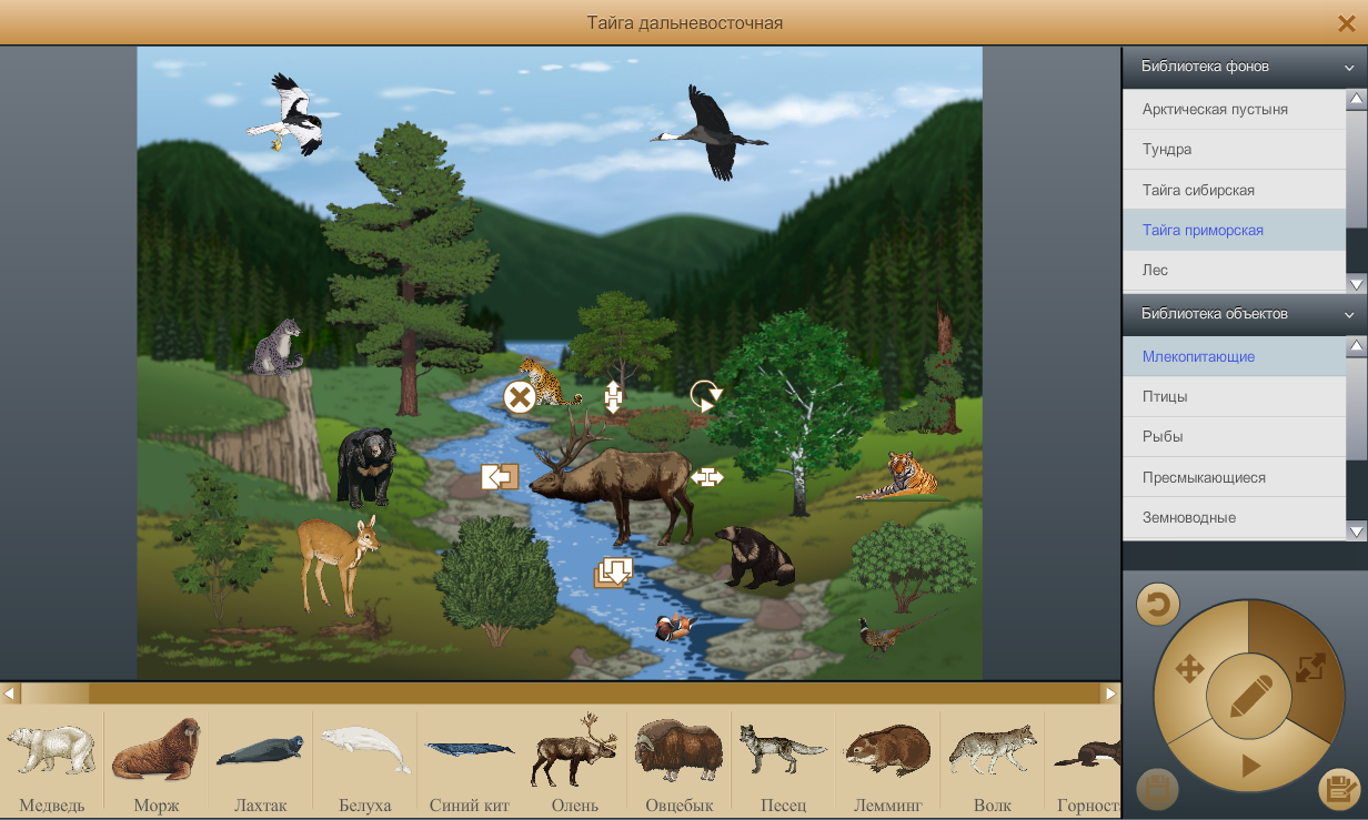 С помощью этого интерактивного инструмента вы создадите природные сообщества из готовых видов представителей фауны, сможете добавить новые объекты и редактировать существующие. Инструмент поможет вам в организации проектной и диагностической деятельности. Пособие представляет собой набор фонов-пейзажей, соответствующих различным природным зонам, и библиотеку изображений растений и животных. При клике на соответствующее изображение проигрывается анимация, иллюстрирующая характерное поведение представителя данного вида, и демонстрируется его краткое текстовое описание, также можно прослушать голоса животных.