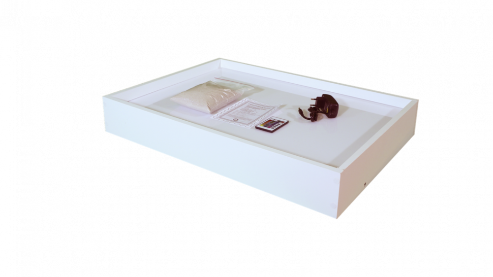 Песочная терапия широко используется психологами при работе с детьми, а в сочетании с разноцветной подсветкой занятия становятся гораздо интересней и разнообразней. Рисование на песке или песком на световом планшете развивает фантазию и творческие способности, мелкую моторику и цветовосприятие стимулирует развитие речи. Планшет с рабочим полем 50х70 см и изготовлен из МДФ и огр стекла, цвет белый. Подсветка цветная светодиодная - 16 цветов, более 250 оттенков, 5 режимов работы Комплектация: 1. световой планшет 2. сетевой адаптер 3. пульт управления подсветкой 4.Натуральный песок (фракция 0,1-0,3) - 1 кг.