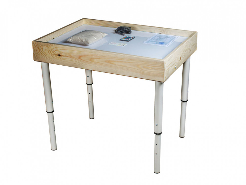 Песочная терапия широко используется психологами при работе с детьми, а в сочетании с разноцветной подсветкой занятия становятся гораздо интересней и разнообразней. Рисование на песке или песком на световом планшете развивает фантазию и творческие способности, мелкую моторику и цветовосприятие  стимулирует развитие речи. Световой стол с рабочим полем 50х70 см изготовлен из массива сосны и огр стекла, цвет натуральный, покрытие - лак на водной основе, на телескопических ножках, которые позволяют настроить высоту для каждого ребенка индивидуально. Подсветка цветная светодиодная - 16 цветов, более 250 оттенков, 5 режимов работы Комплектация: 1. световой стол 2. сетевой адаптер 3. пульт управления подсветкой 4. ножки телескопические - 4 шт 4. натуральный песок (фракция 0,1-0,3) - 1 кг. Ножки телескопические изготовлены из прочной стальной трубы круглого сечения и имеют 4 уровня регулировки высоты.   Уровни Высота ножек Высота стола 1 38,0 см  53,0 см 2 44,0 см  59,0 см 3 50,0 см  65,0 см 4 56,0 см 71,0 см Дополнительно мы рекомендуем приобрести: 1. Крышки и инструменты 2. Стульчик 3. Цветной кварцевый песок  4. Кинетический песок Правила использования стола: Присоедините блок питания к планшету и включите его в розетку. Управление подсветкой осуществляется с помощью пульта как для выбора цвета, так и для выбора режима работы: яркие или пастельные цвета, мерцание или плавные переливы. Рабочую поверхность перед началом использования (далее по необходимости) лучше обработать антистатиком. Насыпаете песок и начинаете фантазировать.  Установка ножек: ВНИМАНИЕ!!! Квадратная площадка ножки крепится в стенки светового планшета шурупами. В дно светового планшета вкручивать шурупы запрещено, так как это может повредить светодиодную подсветку, также нельзя устанавливать шуруп в угол светового стола в место стыка деталей. Регулировка высоты производится с помощью специальных мебельных винтов: чтобы изменить высоту необходимо выкрутить этот винт, установить нужную высоту и снова закрутить винт. Вся процедура регулировки выполняется при помощи простой отвертки (или шуруповерта), т.е. самостоятельное изменение размера детьми практически невыполнимо (требование безопасности).