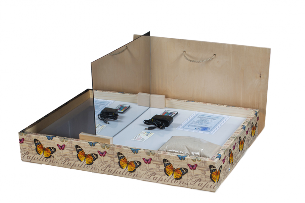 Установите зеркало в центре светового планшета и предложите ребенку начать рисовать на песке и одновременно наблюдать за его отражением в зеркале. Сначала выберите совсем простой объект для рисования и постепенно усложняйте задания – это способствует развитию мелкой моторики и логического мышления, ориентированию в пространстве и знакомству с симметрией. Зеркало из акрилового стекла и два деревянных держателя с пазами для простоты хранения. Размер : 25х50 см