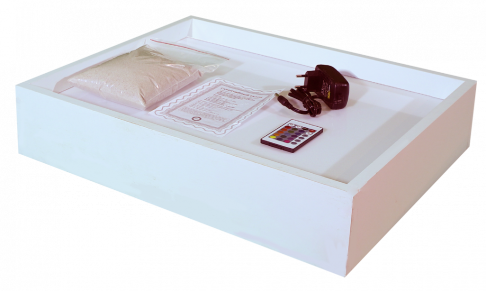 Песочная терапия широко используется психологами при работе с детьми, а в сочетании с разноцветной подсветкой занятия становятся гораздо интересней и разнообразней. Рисование на песке или песком на световом планшете развивает фантазию и творческие способности, мелкую моторику и цветовосприятие стимулирует развитие речи. Планшет с рабочим полем 40х50 см и изготовлен из МДФ и огр стекла, цвет белый. Подсветка цветная светодиодная - 16 цветов, более 250 оттенков, 5 режимов работы Комплектация: 1. световой планшет 2. сетевой адаптер 3. пульт управления подсветкой 4.Натуральный песок (фракция 0,1-0,3) - 1 кг.