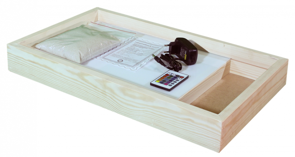 Песочная терапия широко используется психологами при работе с детьми, а в сочетании с разноцветной подсветкой занятия становятся гораздо интересней и разнообразней. Рисование на песке или песком на световом планшете развивает фантазию и творческие способности, мелкую моторику и цветовосприятие стимулирует развитие речи. Планшет с рабочим полем 30х40 см и отсеком для хранения песка и инструментов изготовлен из массива сосны и огр стекла, цвет натуральный, покрытие - лак на водной основе. Подсветка цветная светодиодная - 16 цветов, более 250 оттенков, 5 режимов работы Комплектация: 1. световой планшет 2. сетевой адаптер 3. пульт управления подсветкой 4.Натуральный песок (фракция 0,1-0,3) - 2 кг.