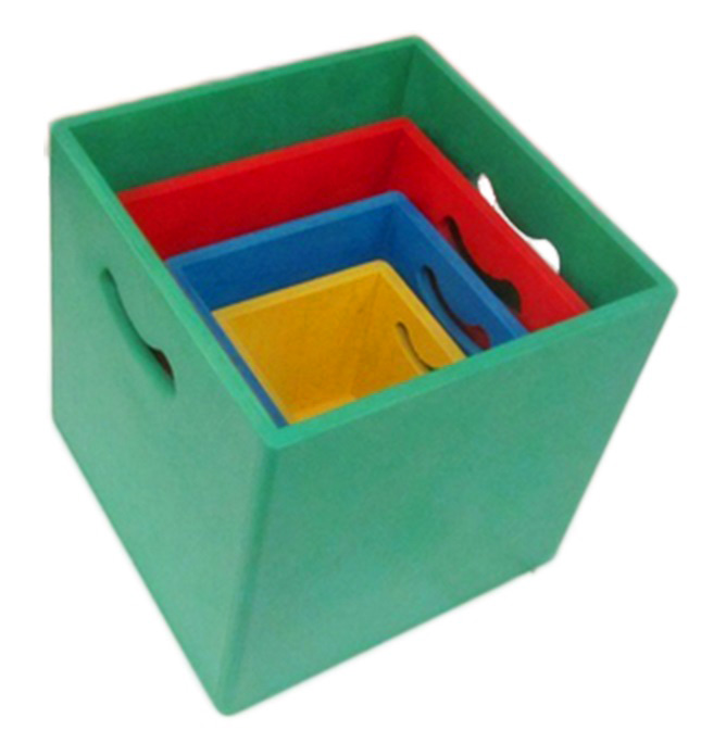 Кубы разновысокие (по принципу матрешки). Комплект из 4-х штук. Кубы различных размеров в комплекте из четырех штук. Выкрашены в четыре основных цвета: желтый, красный, синий, зеленый. Есть удобные ручки для переноски. Размеры:  200,260,300,400 мм