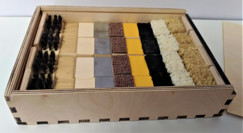 В деревянную коробку с выдвижной крышкой уложены комплекты, каждый из которых содержит по 9 элементов с разной текстурой поверхности. Игра рассчитана на 2-9 игроков. В более сложном варианте игры основное внимание уделяется не определению элемента, а описанию свойств его поверхности и возникающих тактильных ощущениях. Игра служит для развития навыка тактильного различения и умений распознавать и сортировать предметы на ощупь