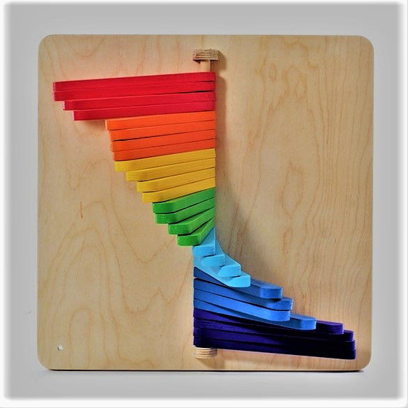 На панели "Радуга"  закреплены 28 цветных деревянных брусков, вращающихся вогруг оси. С помощью панели можно формировать представления о геометрических формах, об их размере и цвете.   Размеры 40х40 см.