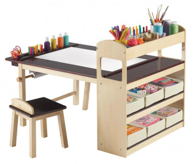 РАЗМЕРЫ: 120см*76см*80см Табурет: 32см*32см*32 см.   В набор входит стол, боковой стеллаж для хранения, конструктивно соединенный со столом, табурет, бумагодержатель с рулоном бумаги. Форма и конструкция  детского уголка соответствуют своему назначению - здесь созданы идеальные условия для рисования, лепки, вышивания и других прикладных ремесел. Две нижние полки стеллажа укомплектованы тремя контейнерами каждая; третья полка - конструктивное продолжение стола; верхняя полка - секционная, для мелких вещей. Табуреи квадратный, с опорой сзади.    На полки может быть дополнительно поставляться коробки из фанеры размером 200х200х150 м