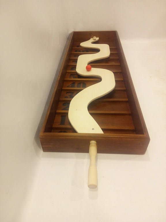 Увлекательная игра на ловкость и координацию также помогает развивать мелкую моторику, глазомер и тактическое мышление. Количество игроков как и их возраст не ограничены. Цель каждого игрока набрать максимальное количество очков. Количество попыток обговаривается до начала игры. По очереди каждый игрок, управляя извилистой дорожкой с помощью рукоятки, пытается провести шарик как можно дальше. Под дорожкой игровое поле разделено на 11 секторов, на которых написаны цифры кратно 10 от 0 до 100. Игрок зарабатывает столько баллов, сколько написано в ячейке куда упадет шарик. По завершению всех попыток все баллы суммируются и определяется победитель. Комплектация : игровое поле - 1 шт, шарик - 1 шт Размеры : 122х40 см Материалы : массив дерева, фанера, покрытие - морилка и акриловый лак