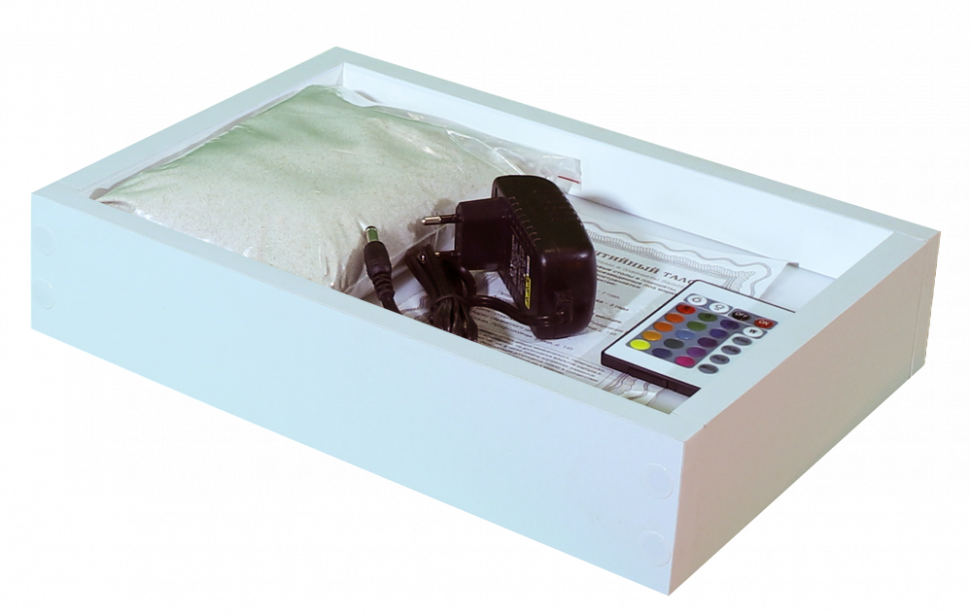 Песочная терапия широко используется психологами при работе с детьми, а в сочетании с разноцветной подсветкой занятия становятся гораздо интересней и разнообразней. Рисование на песке или песком на световом планшете развивает фантазию и творческие способности, мелкую моторику и цветовосприятие  стимулирует развитие речи. Планшет с рабочим полем 20х30 см изготовлен из МДФ и огр стекла, цвет белый. Подсветка цветная светодиодная - 16 цветов, более 250 оттенков, 5 режимов работы Комплектация: 1. световой планшет 2. сетевой адаптер 3. пульт управления подсветкой 4.Натуральный песок (фракция 0,1-0,3) - 1 кг. Дополнительно мы рекомендуем приобрести: 1. Крышки и инструменты 2. Ножки телескопические - 4 уровня регулировки по высоте. 3. Стульчик 4. Цветной кварцевый песок  5. Кинетический песок Правила использования: Присоедините блок питания к планшету и включите его в розетку. Управление подсветкой осуществляется с помощью пульта как для выбора цвета, так и для выбора режима работы: яркие или пастельные цвета, мерцание или плавные переливы. Рабочую поверхность перед началом использования (далее по необходимости) лучше обработать антистатиком. Насыпаете песок и начинаете фантазировать.