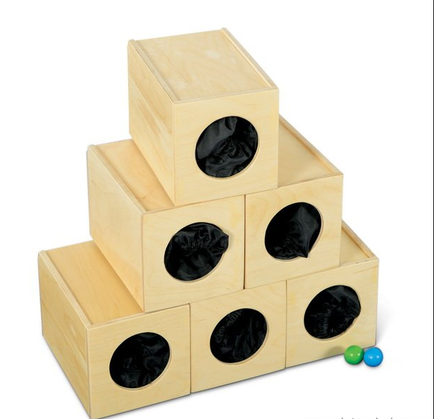 Набор из шести ячеек, каждая из которых, выполнена в виде ящичка. В торцевой фасадной части каждой из ячеек, располагается круглое отверстие, которое окантовано тканевым сквозным мешочком-рукавом. Верхняя сторона имеет выдвигающуюся крышку, для доступа внутрь ячейки. Организатор игры, заранее помешает через выдвигающуюся крышку различные предметы по одному в каждую ячейку, предлагает ребенку просунуть руку во внутрь и через мешочек-рукав определить вслепую на ощупь спрятанный в ячейке предмет.  25*25*15см - размер одной ячейки. Возможно приобретение дополнительных ячеек.