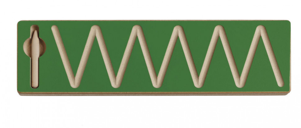Дерево. В комплекте доска размером не менее 10х35х1,4 см с фигурными прорезями повторяющихся элементов прямоугольных очертаний в виде "зигзаги", стилус. На каждой доске слева расположено углубление для хранения стилуса. Стилус должен иметь один конец зауженный, но не острый.  Способствует подготовке руки к рисованию и письму, развитию моторики кисти руки, зрительно-моторной координации, наблюдательности, пространственного мышления, зрительного восприятия.