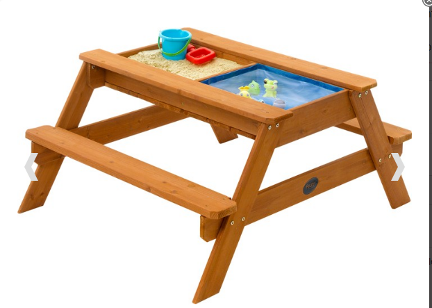 Этот очень разносторонний песочный и водный стол. Его можно использовать в качестве стола для пикника в саду на открытом воздухе. Откройте деревянную панель посередине и аккуратно закрепите в основании стола - и Ваши дети могут одновременно наслаждаться игрой с песком и водой!  Изготовлен из высококачественной древесины В комплект входит детский кварцевый песок натурального цвета.