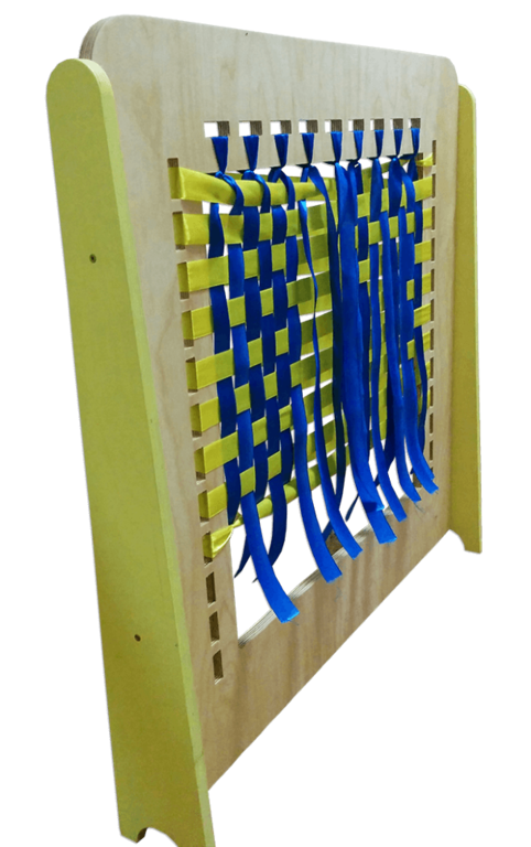 Панель развивающая Плетение выполнена из фанеры, по центру расположена желтая и синяя ткань для плетения.  Развивает мелкую моторику  и фантазию. Возраст использования от 3-х лет Размеры 77 × 77 × 13 см Цвет лент на усмотрение производителя.