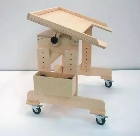 Стол на колесиках c регулируемой высотой предназначен для реабилитации детей с ограниченными возможностями и синдромом ДЦП. Устройство оснащено столешницей, откидной спинкой с регулировкой высоты. Изделие можно использовать в комплекте с функциональным креслом, коляской. Все детали стола (за исключением колес и крепежных элементов) выполнены из многослойной фанеры. Толщина фанеры 18 мм, количество слоев 15 шт. Материал крепежных элементов - Металл Ширина столешницы 750 мм, глубина столешницы 600 мм Края столешницы закруглены На трех краях столешницы располагаются борта Высота бортов 25 мм Наличие выреза на столешнице, глубина выреза 200 мм, ширина выреза 510 мм Внутренние и внешние углы выреза закруглены Возможность регулировки угла наклона столешницы Минимальный угол наклона столешницы - 0 градусов Максимальный угол наклона столешницы - 30 градусов Ножки стола на колесах Тип шин на колесах - Литые, резиновые Стояночный тормоз на каждом колесе Длина ножки - 650 мм Ящики в комплекте со столом: длина 300 мм, высота 140 мм, глубина 105 мм Высота стола изменяемая - минимальная высота стола 690 мм, максимальная высота стола 930 мм Размеры 75 × 60 × 93 см Размеры столешницы 75 × 60 см Материал изготовления фанера