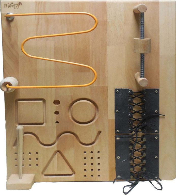Панель настенная с тренажерами N1 применяется для выработки ежедневных действий, используемых в бытовых условиях. Направлена для развития рук и моторики кистей, а также на улучшение координации. Количество тренажеров ­6: Тренажер вкручивание­-выкручивание; Тренажер спираль-­горизонталь; Тренажер винтовое вращение; Тренажеры со стилусами для развития координации; Шнуровки (2 шт). Размеры 50 × 60 см Материал дерево, металл
