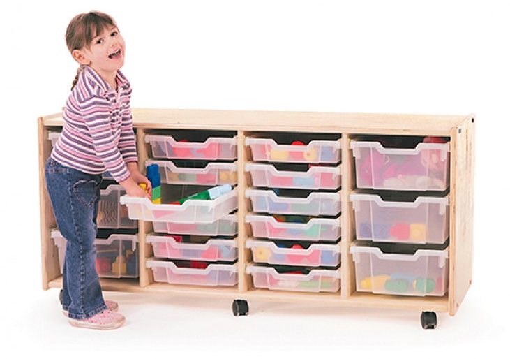 Универсальный стеллаж, выполнен из фанеры. Для удобства перемещения оснащен колесиками. Прозрачные лотки позволяют легко просматривать их содержимое. Подходит для хранения дидактических материалов, канцтоваров и не габаритных игрушек (мозаика, конструктор, кубики, кукольный театр). Может быть использован для зонирования пространства.   4 секции 6 больших лотков 12 маленьких лотков