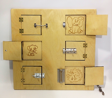 Данная панель тренирует  разные движения пальцев и рук, развивать координированную работу обеими руками.  Различные системы открывания/ закрывания способствуют развитию логического мышления и понимания последовательности действий. За каждой дверкой прячутся животные: котик, собачка, тигр, слоник, обезьянка и ежик!  Размер 50*50 Материал фанера