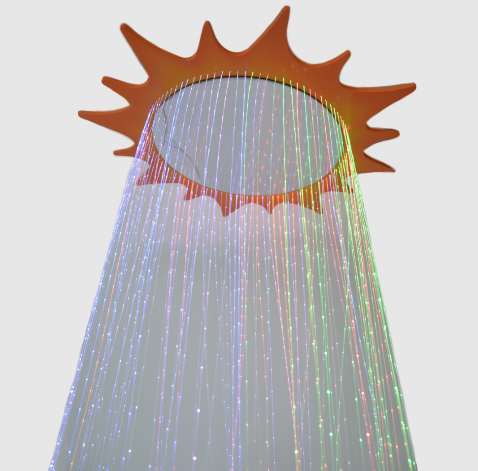 Яркое солнышко в самом центре сенсорной комнаты! Фиброоптические волокна (100 шт длиной 200 см каждое) равномерно распределены в центре основания. выполненного в форме солнышка, и спускаются разноцветными лучами в руки ребенка. В центре солнышка расположено безопасное зеркало для увеличения визуального эффекта свечения волокон. Источник света для волокон установлен сверху, к потолку фибердуш подвешивается на цепях, что позволяет регулировать высоту. Управление и выбор цвета или режима смены цветов производится с помощью пульта. Диаметр : 70 см Материалы : фанера, металл, акриловое зеркало, фиброоптическое волокно