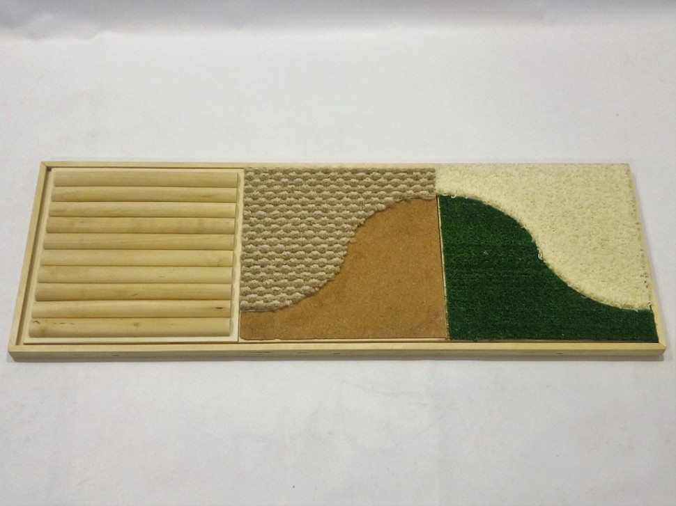Содержит деревянную плату из фанеры и три тактильные панели (размером 30×30 см), легко вставляющиеся в плату. В наборе плата и три панели: одна – с деревянными (березовыми) палочками, которые образуют выступы и впадины; две – с покрытием из разных материалов (искусственный мох и мягкое ковровое покрытие; жесткое ковровое и пробковое покрытие), стык которых воспринимается на ощупь