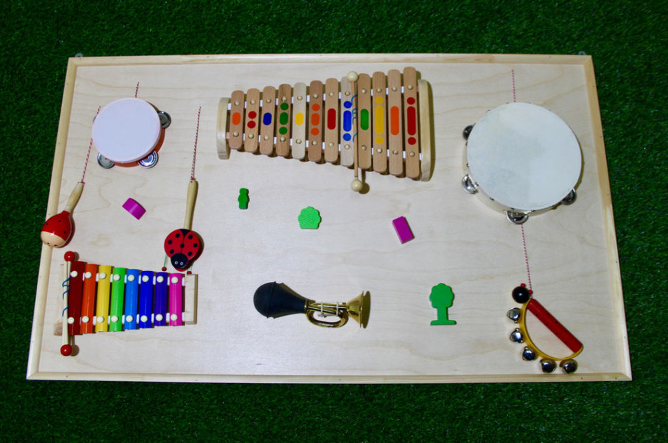 Панель с музыкальными инструментами — предназначена для развития у детей слуха и музыкальных способностей. Благодаря размерам панели и количеству закрепленных инструментов, ей одновременно могут пользоваться несколько человек. Можно проводить групповые занятия, у детей создается настоящий простор для музыкального творчества. На панели надежно закреплены ксилофон, бубен, гусли и клаксон, трещотка. Все материалы высококачественные, надежные и долговечные. 1000х500