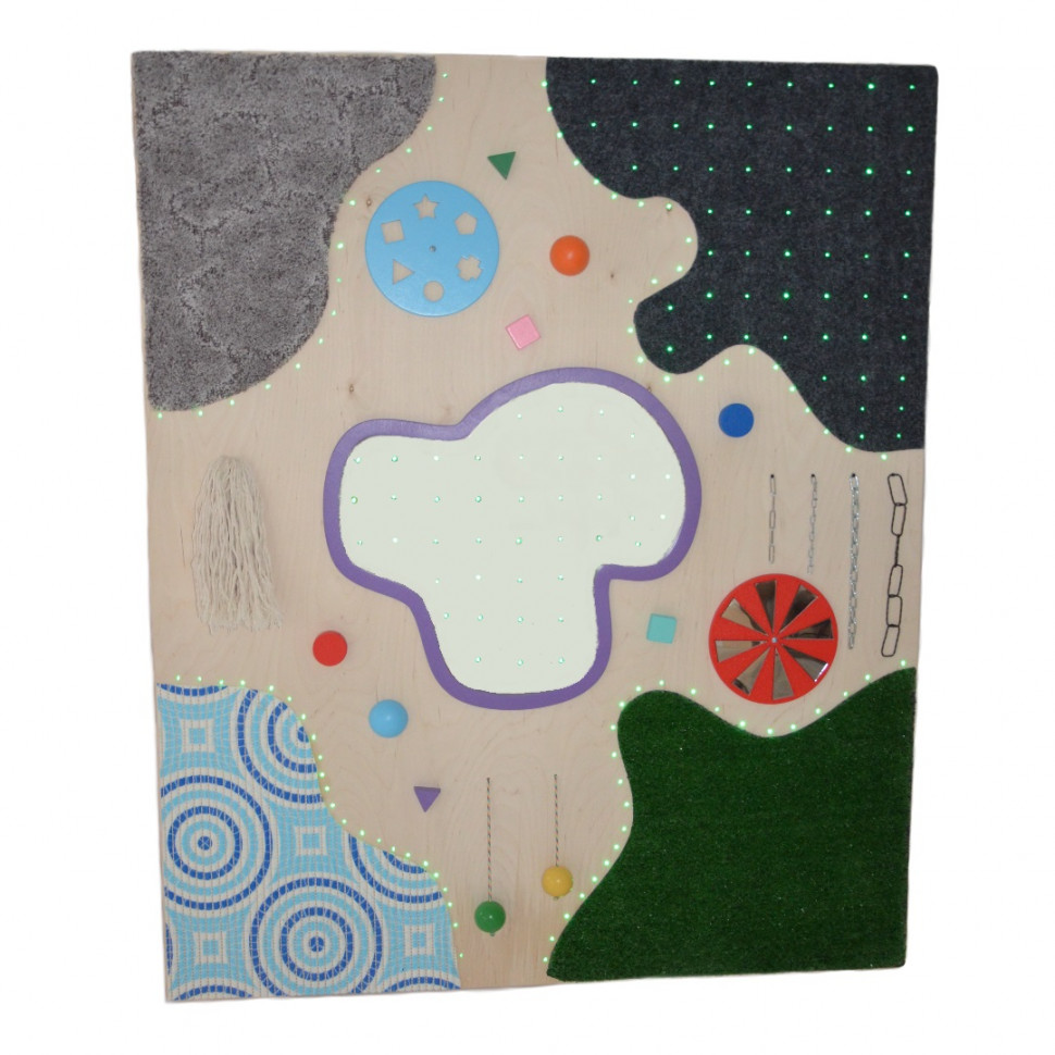 Фиброоптическая тактильная панель предназначена для зрительной и тактильной стимуляции, развивает осязательные навыки. Фиброоптическое волокно создает эффект мерцания при полном или частичном отсутствии освещения. Волокна с помощью источника света меняют цвет. Выбор цвета и режима смены цветов осуществляется с помощью пульта дистанционного управления (входит в комплектацию). На панели установлены различные тактильные элементы: цепочки -3 шт, пучок веревок - 1 шт, объемные деревянные фигуры -10 шт.Все углы панели покрыты разными фактурными материалами: ковролин с жестким ворсом, ковролин с мягким ворсом, покрытие из ПВХ, покрытие "травка". В центре панели расположено акриловое зеркало. Все покрытия, расположенные по углам панели, и зеркало усеяны светящимися точками (фиброоптическое волокно).  Фиброоптическая тактильная детская панель рекомендуется для оснащения игровых и сенсорных комнат в детском саду и других дошкольных учреждений. Материал корпуса : дерево, фанера Размер : 100х120 см