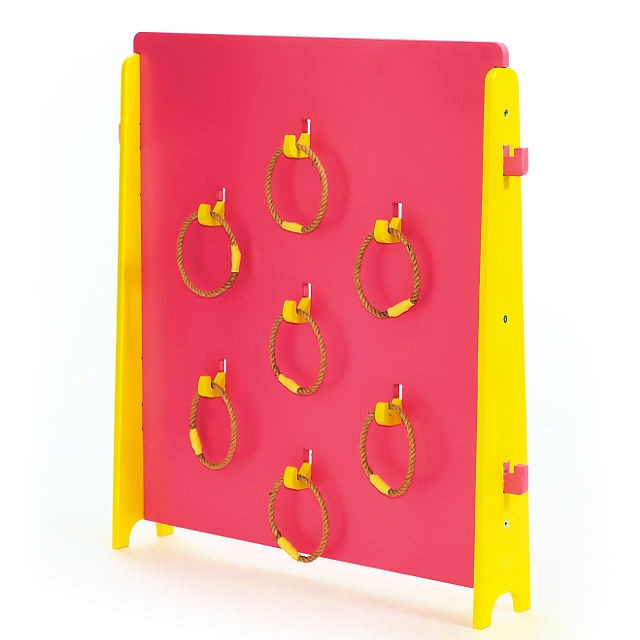 Деревяннная панель для бросания веревочных колец, развивает у ребенка меткость и ловкость, силу рук. Допускает стыковку с другими игровыми панелями аналогичной конструкции.  Размер изделия 78х88х12 см.