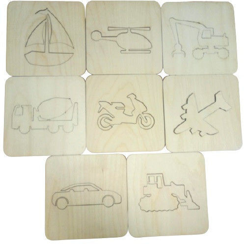 Комплект трафаретов "Транспорт " ??   Размер трафарета 8см*8см  Материал: березовая фанера. Фигуры предназначены как для занятий как на бумаге, так и на световом столе. Благодаря внутренним и внешним фигурам, можно создавать картины,  развивая фантазию, мышление и воображение ребенка. Рисуя песком фигуры можно обводить как по внутренней стороне каждой детали, так и по внешней, как пальчиком, так и кисточкой, используя методы песочного рисования: насыпанием песка из кулачка, рисованием по присыпанному фону.