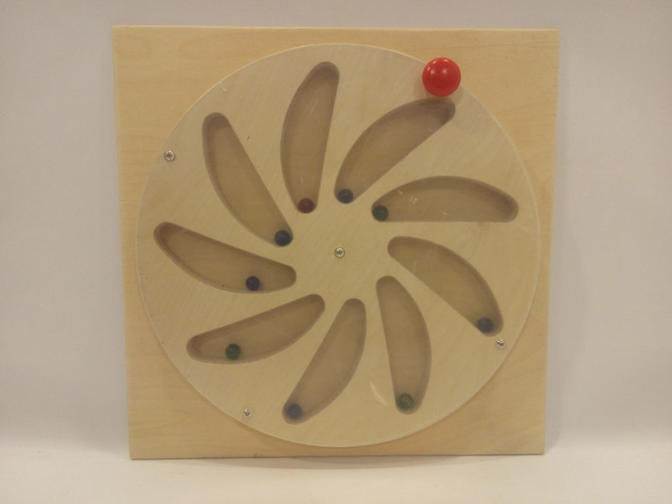Для детских игровых и сенсорных комнат широко применяются разнообразные тактильно-развивающие панели. В процессе игры ребенок развивает визуальное и акустическое восприятие, тренирует мелкую моторику, учится отличать на ощупь различные материалы и предметы по их фактуре, учится понимать логику работы простых игровых механизмов и интерактивного взаимодействия. Длина: 40см Высота: 40см Толщина: 35см Диамет: 37см Материал:  Фанера березовая, шарик стеклянный