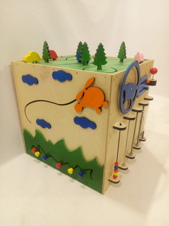 Кубик развивает тактильные ощущения, зрительную стимуляцию и воображение, мелкую моторику. Одновременно могут играть несколько детей. Размеры 60*60*60