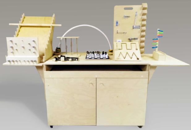 Специализированный тренажер для развития мелкой моторики, двигательных функций, интеллектуальных и бытовых навыков, формирование понятий о форме, цвете и размере, координации движений. Подходит для всех возрастных групп. Размеры: В85/Ш120/Г70. При расправленных панелях Ш210см.