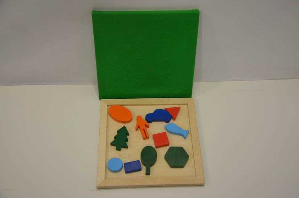 В комплекте — деревянная основа (33×33×3,5 см) и набор деревянных элементов разных геометрических форм со скругленными углами (размер от 5 до 11 см), фигурки людей, животных, деревьев, ярко окрашенных в основные цвета; крышка из мягкого материала. Варианты игры: Фигурки выкладываются на основу и прячутся под мягкую крышку, а дети по очереди пытаются их опознать — ощупывают фигурки одну за другой и отвечают на вопросы: что ты можешь сказать об этих фигурках; чем они различаются; есть ли среди них похожие? После того, как ребенок сумеет опознать все фигурки, можно усложнить задачу, добавив другие знакомые детям предметы. Игра позволяет формировать тактильные навыки, способствует развитию и выразительности речи, обогащению словарного запаса детей. Рекомендуется также детям с особыми потребностями. Количество игроков — от 1 до 4.