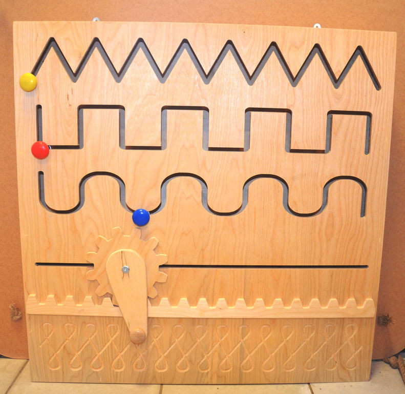 Модуль предназначен для развития запястья, путем выполнения различных движений, связанных с передвижением ручек по прорезям. Верхняя прорезь предлагает простые  движения сверху вниз; в следующем ряду движения кисти вертикально-горизонтальные, далее – криволинейные и, наконец, вращательные движения запястья. Движения происходят слева направо, что дополнительно формирует направления движения, как при письме. Главное назначение модуля – подготовка руки и глаз к письму. Размер: 70*70 см.