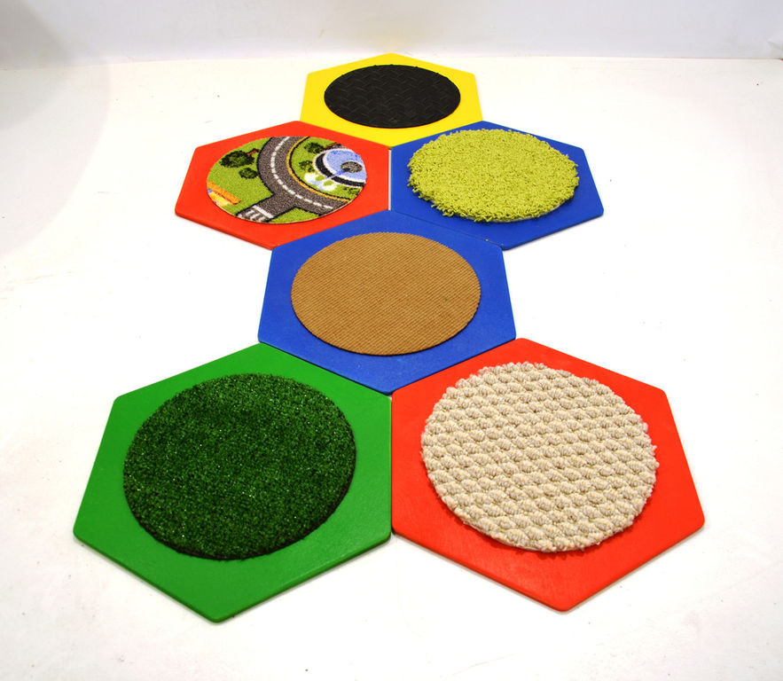 В комплекте: 2 красных, 2 синих, 1 зелёный, 1-жёлтый шестиугольник с разными тактильными покрытиями.     Способствует тактильно-сенсорному  развитию; развитию способностей целенаправленного совершенствования движений различных частей тела; массажу конечностей, развитию внимания, развитие мышления;  закреплению  умения  различать  цвета. Комплект предназначен для детей в возрасте от 1 года; Размер 1 шестигранника:  31х28х0,6см