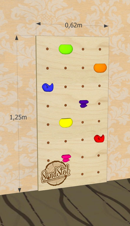 Небольшой скалодром XS Размер: 1250х620 мм Зацепы: 7 шт Покрытие: Лак КРЕПЛЕНИЯ СКАЛОДРОМА Гайка, что позволяет легко и быстро снять зацепы, переставить или добавить новые! НАДЕЖНЫЕ МАТЕРИАЛЫ Фанера 15 мм, экологически чистая без фенола! ЭКОЛОГИЧНОЕ ПОКРЫТИЕ Мы используем экологически чистые материалы от мировых производителей!