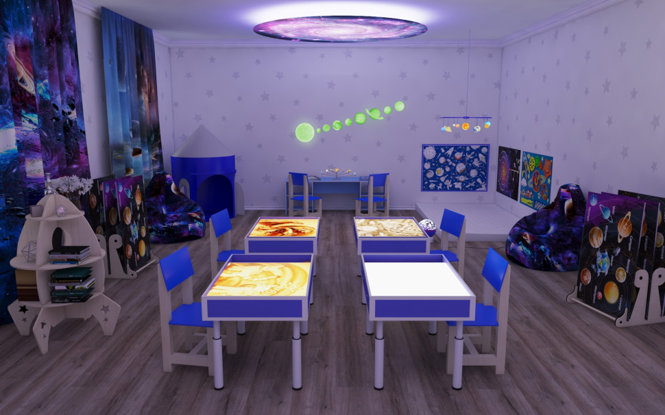 Тема космоса является интересной и завораживающей с детства, так как она является одной из скрытых сфер и тяжела для изучения. Она манит своей загадочностью и провоцирует работу фантазии в любом возрасте. Чтобы дети с интересом погружались в мир космоса и изучали все его особенности, была придумана игровая комната "Космос". Комплектация комнаты включает в себя оборудование на космическую тематику, с помощью которого дети почувствуют себя настоящими космонавтами, смогут развить мышление, включить фантазию и расширить свой кругозор.  Позвольте им дотянуться до звезд и исследовать космос! Вы можете самостоятельно составить любую комплектацию комнаты и не обязательно из нашего ассортимента, так как работаем и по индивидуальным заказам. Цена указана за комплект, включающий в себя: Шторы "Космос" - 2 комплекта Подставка для крышек - 1 шт Крышка-игра для светового планшета "Планеты" - 4 шт Пуфик "Космос" - 2 шт Стеллаж "Ракета" - 1 шт Складной каркас "Ракета" с чехлом - 1 шт Дидактический стол "Космос" (синий) - 1 шт Набор дидактических пособий "Космос"- 1 шт Набор модулей "Планеты" (настольный, настенный и подвесной) - 1 шт Фиброоптический модуль "Галактика 1" - 1 шт Мат напольный (1х2м) - 1 шт Световой стол для рисования песком "Космос" (ЛДСП) - 4 шт Детский стульчик "Космос" - 6 шт Проектор "Звездное небо" - 1 шт Настенная развивающая панель "Космос" - 1 шт Бизиборд "Космос" - 1 шт Настенная раскраска "Прямоугольник" (многоразовая) - 1 шт Раскраска "Космос" - 1 шт