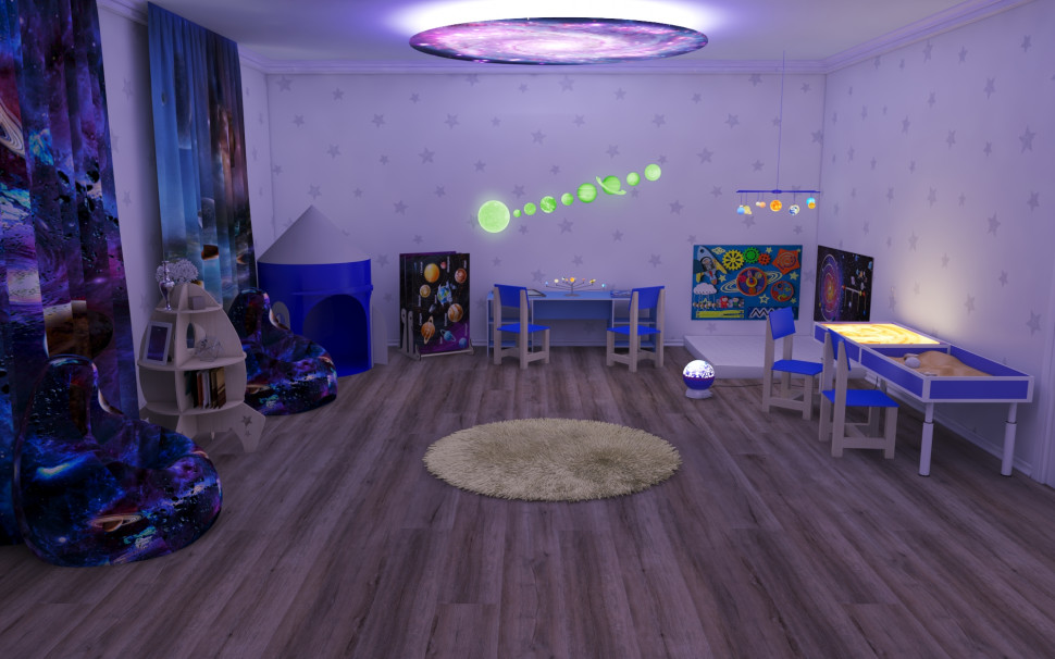 Любой ребенок мечтает совершить космическое путешествие, стать капитаном межгалактического космического корабля, посидеть за его штурвалом, либо же просто поиграть в настоящем звездолете. Для того, чтобы каждый ребенок смог хотя бы на мгновение исполнить свою мечту, мы придумали игровую комнату "Космос", которая подойдет даже для небольшого пространства размером около 25 м2. Дети с восторгом оценят космический интерьер и будут счастливы окунуться в мир звезд и планет. Преподаватель сможет придумать множество игр, которые увлекут ребенка в богатый мир космоса. Здесь можно развивать моторику рук, осязание, внимание, воображение и игровое восприятие пространства. Вы можете самостоятельно составить любую комплектацию комнаты и не обязательно из нашего ассортимента, так как работаем и по индивидуальным заказам. Цена указана за комплект, включающий в себя: Шторы "Космос" - 2 комплекта Пуфик "Космос" - 2 шт Стеллаж "Ракета" - 1 шт Складной каркас "Ракета" с чехлом - 1 шт Подставка для крышек - 1 шт Крышка-игра для светового планшета "Планеты" - 2 шт Детский стульчик "Космос" - 4 шт Дидактический стол "Космос" (синий) - 1 шт Набор модулей "Планеты" (настольный, настенный, подвесной) - 1 шт Набор дидактических пособий "Космос" - 1 шт Фиброоптический модуль "Галактика 1" - 1 шт Мат напольный (1х2м) - 1 шт Настенная развивающая панель "Космос" - 1 шт Бизиборд "Космос" - 1 шт Проектор "Звездное небо" - 1 шт Световой стол для рисования песком и песочница "2 в 1" - 1 шт