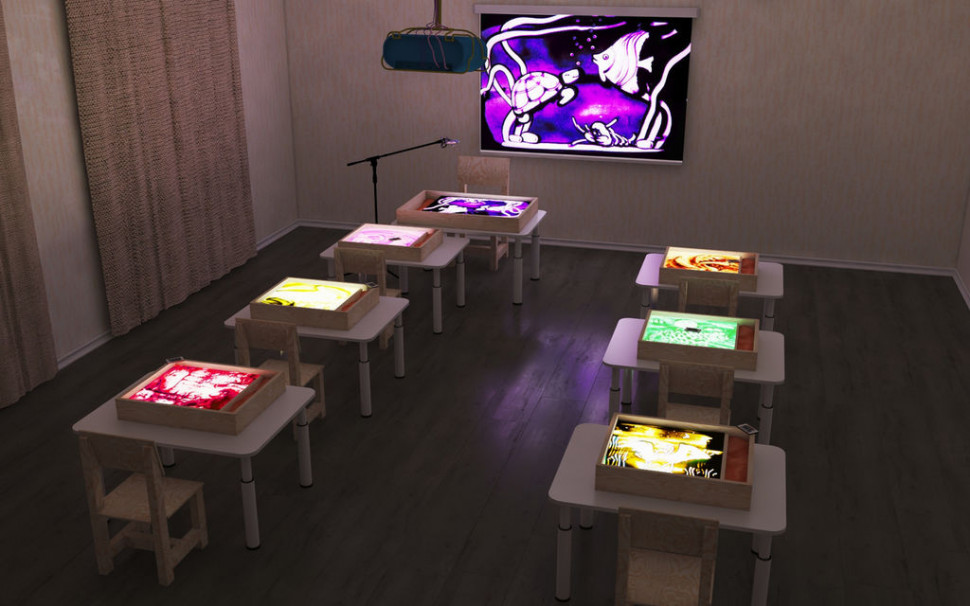 Студия для рисования песком - идеальное решение для организации группового творчества и обучения детей, рассчитанная на 6 детей и 1 педагога. Для начала занятий вам потребуется лишь помещение со столами и доступом к электрической сети. Комплектация студии: световой планшет "Макси" с отсеком для учителя (сосна, раб. поле 50х70 см) - 1 шт световой планшет "Стандарт" с отсеком для учеников (сосна, раб. поле 40х50 см) - 6 шт сетевой адаптер - 7 шт веб камера - 1 шт штатив для камеры - 1 шт натуральный песок (фракция 0,1-0,3) - 15 кг  совочек с щеточкой - 1 шт Дополнительно рекомендуем приобрести:  Комод для хранения планшетов Крышки для планшетов и инструменты Проектор Экран для проектора Стулья