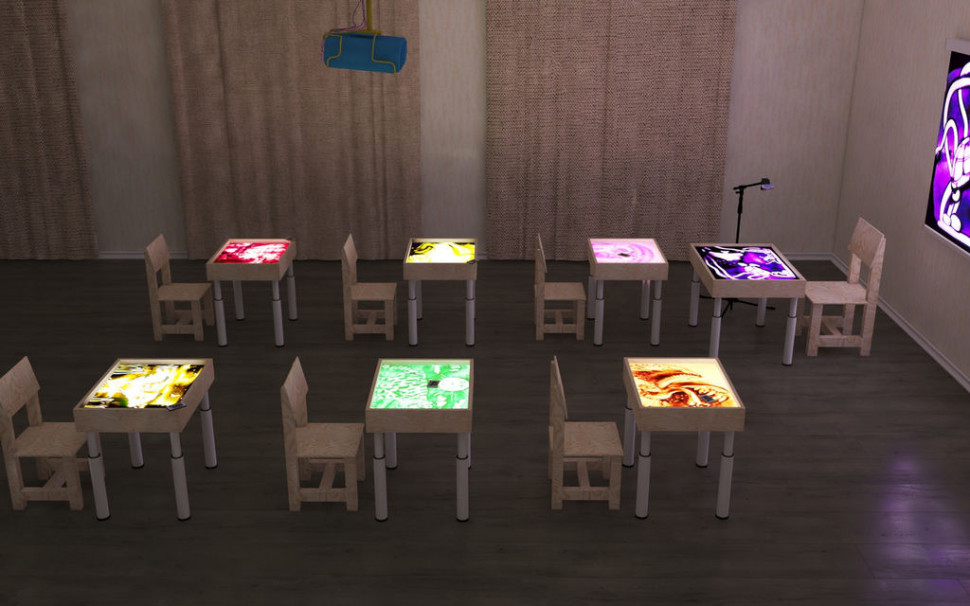 Студия для рисования песком - идеальное решение для организации группового творчества и обучения детей, рассчитанная на 6 детей и 1 педагога. В комплекте поставляются световые столы на телескопических ножках, которые позволяют подстроить высоту для любой возрастной группы. Для начала занятий вам потребуется лишь помещение с доступом к электрической сети. Комплектация студии: световой стол "Макси" для учителя (сосна, раб. поле 50х70 см) - 1 шт световой стол "Стандарт" для учеников (сосна, раб. поле 40х50 см) - 6 шт сетевой адаптер - 7 шт веб камера - 1 шт штатив для камеры - 1 шт натуральный песок (фракция 0,1-0,3) - 15 кг  совочек с щеточкой - 1 шт Дополнительно рекомендуем приобрести:  Крышки для столов и инструменты Проектор Экран для проектора Стулья Ножки телескопические изготовлены из прочной стальной трубы круглого сечения и имеют 4 уровня регулировки высоты.   Уровни Высота ножек Высота стола 1 38,0 см  53,0 см 2 44,0 см  59,0 см 3 50,0 см  65,0 см 4 56,0 см 71,0 см  Характеристики  Диаметр внешней трубы, мм 40 Диаметр внутренней трубы, мм  32 Толщина стали, мм 1,5 Количество уровней регулировки 4 Пластиковая заглушка для защиты покрытий пола от повреждений  есть Цвет слоновая кость, белый  Установка ножек: ВНИМАНИЕ!!! Квадратная площадка ножки крепится в стенки светового планшета шурупами. В дно светового планшета вкручивать шурупы запрещено, так как это может повредить светодиодную подсветку, также нельзя устанавливать шуруп в угол светового стола в место стыка деталей. Регулировка высоты производится с помощью специальных мебельных винтов: чтобы изменить высоту необходимо выкрутить этот винт, установить нужную высоту и снова закрутить винт. Вся процедура регулировки выполняется при помощи простой отвертки (или шуруповерта), т.е. самостоятельное изменение размера детьми практически невыполнимо (требование безопасности).