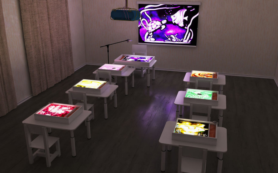 Студия для рисования песком - идеальное решение для организации группового творчества и обучения детей, рассчитанная на 6 детей и 1 педагога. Для начала занятий вам потребуется лишь помещение со столами и доступом к электрической сети. Комплектация студии: световой планшет "Макси" с отсеком для учителя (МДФ, раб. поле 50х70 см) - 1 шт световой планшет "Стандарт" с отсеком для учеников (МДФ, раб. поле 40х50 см) - 6 шт сетевой адаптер - 7 шт веб камера - 1 шт штатив для камеры - 1 шт натуральный песок (фракция 0,1-0,3) - 15 кг  совочек с щеточкой - 1 шт Дополнительно рекомендуем приобрести:  Комод для хранения планшетов Крышки для планшетов и инструменты Проектор Экран для проектора Стулья