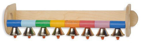 8 колокольчиков с разными нотами, на которых можно играть мелодию пальцами или всей рукой. Каждому звуку присваивается цвет. Колокольчики закреплены на настенном деревянном каркасе. Размер: 52х14х13 см
