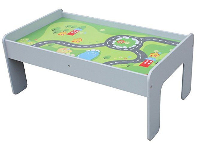 Стол-подставка для деревянной железной дороги - удобное дополнение к детским играм. На нем будет удобно разместить и железную дорогу, и целый игрушечный городок, или просто играть в настольные игры и заниматься творчеством (рисовать, лепить, мастерить). Бортики по краям не дадут мелким игрушкам рассыпаться и потеряться.  Особенности: - Столик выполнен из МДФ - Изображение на столешнице может отличаться от представленного на картинке - это зависит от серии выпуска столика - По бокам столика есть небольшие бортики - У него четыре ножки - Стол продается без игрушек - Высота столика 41 см Размеры: 84х120х41 см