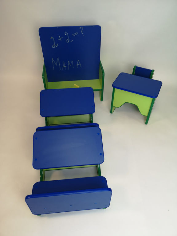 Набор мебели "Школа" для кукол, ростом 35-50 см. В комплект входит школьная доска, на которой дети смогут писать, стол со стулом для учителя и 2 парты для учеников.