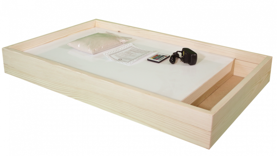Песочная терапия широко используется психологами при работе с детьми, а в сочетании с разноцветной подсветкой занятия становятся гораздо интересней и разнообразней. Рисование на песке или песком на световом планшете развивает фантазию и творческие способности, мелкую моторику и цветовосприятие стимулирует развитие речи. Планшет с рабочим полем 50х70 см и отсеком для хранения песка и инструментов изготовлен из массива сосны и огр стекла, цвет натуральный, покрытие - лак на водной основе. Подсветка цветная светодиодная - 16 цветов, более 250 оттенков, 5 режимов работы Комплектация: 1. световой планшет 2. сетевой адаптер 3. пульт управления подсветкой 4.Натуральный песок (фракция 0,1-0,3) - 2 кг.